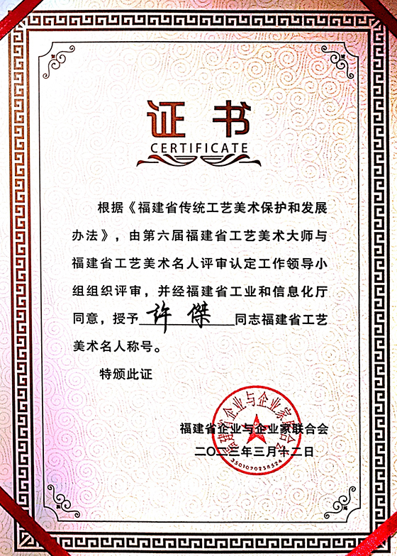 被授予“福建省工艺美术名人”荣誉称号