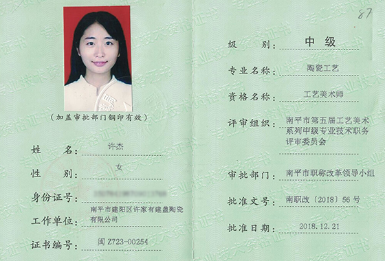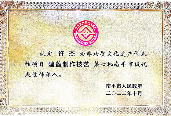 被认定为“非物质文化遗产建盏制作技艺南平市代表性传承人”