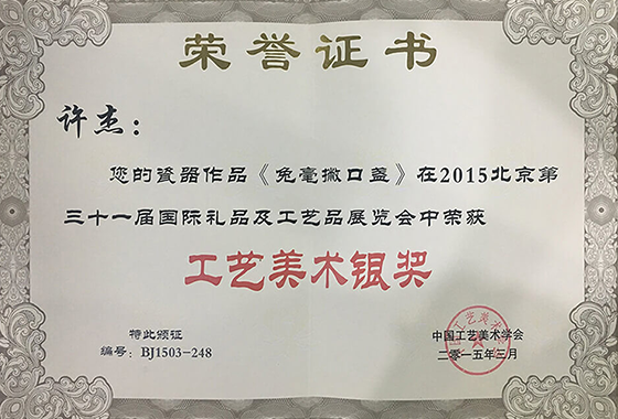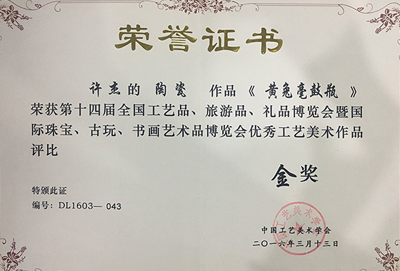 作品《黄兔毫鼓瓶》荣获第十四届全国工艺品旅游品、礼品博览会暨国际珠宝、古玩、书画艺术品博览会优秀工艺美术作品评比金奖