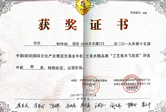 作品建窑《柴烧茶末撇口》荣获深圳国际文化产业博览会 “工艺美术飞花奖”铜奖