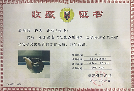 作品《飞鸢公道杯》被福建省艺术馆非物质文化遗产博览苑收藏