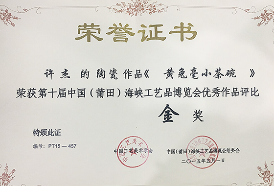 作品《黄兔毫小茶碗》荣获第十届中国(莆田)海峡工艺品博览会优秀作品评比金奖