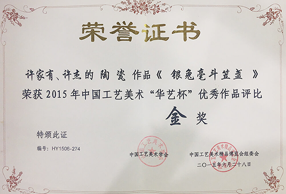 作品《银兔毫斗笠盏》荣获2015年中国工艺美术“华艺杯”优秀作品评比金奖