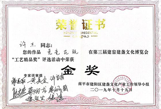 作品《兔毫花瓶》荣获第三届建窑建盏文化博览会“工艺精品奖”金奖